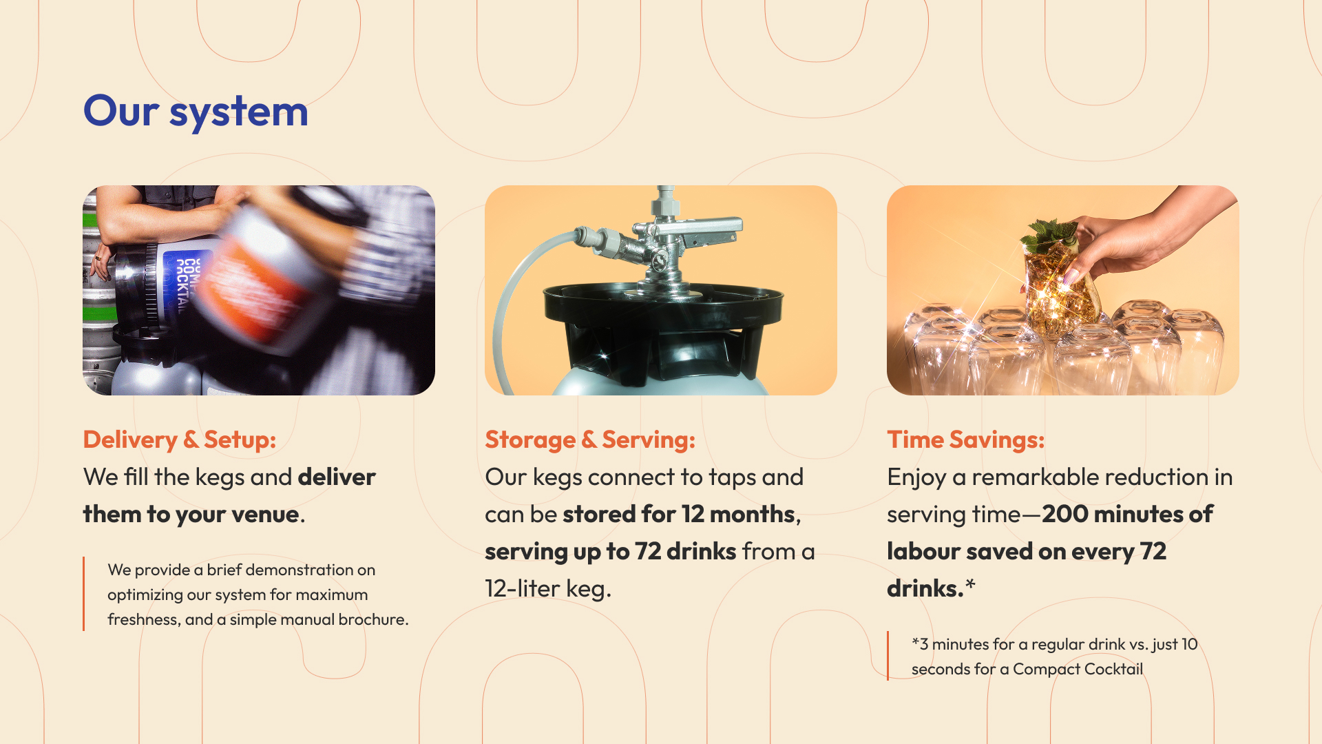 With the identity in place, I built the website, sales deck, and visuals around a simple story — Plug. Pour. Serve. — making it easy for bars and distributors to understand the system at a glance.